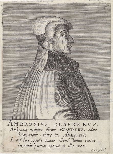Curator: Philips Galle's engraving, "Portret van Rudolf Agricola," created in 1572, offers a fascinating glimpse into a Renaissance intellectual. It's currently housed in the Rijksmuseum. What are your initial thoughts? Editor: It strikes me as austere, almost stoic. The lines are incredibly precise, lending a gravity to the subject, a humanist of the Northern Renaissance, by the looks of it. The materiality is what grabs my attention. Curator: The print medium itself, the engraving technique, speaks volumes. Consider the sheer labor involved in producing those fine, controlled lines—a network of incisions into the copperplate, mirroring Agricola’s meticulous intellectual pursuits. We observe consistent hatching that denotes volume, depth, form. Editor: Exactly! And think about the engraver, Galle, and the economy that surrounds him; he would be working as a highly skilled craftsperson dependent on the patronage system of that time to make ends meet through reproducing portraiture, for example. The act of producing multiples changes art making at this time too; an ability to reach greater audiences to impart wisdom through printed word. Curator: Note how the formal elements support this air of Renaissance intellectualism. Agricola is framed frontally with little affect, his gaze turned slightly as if contemplating weighty matters, reflecting ideals of humanist thought. Galle’s craftsmanship, like Agricola's dedication to scholarly perfection, underscores this dedication to detail. The lettering that follows seems significant, the semiotics seem quite sophisticated here! Editor: Let's consider the role of printmaking at the time. The reproduction of Agricola's image democratized it, shifting cultural value beyond just aristocratic art buyers, which has resonance. The use of standardized printing processes is the genesis of modern methods of fabrication that changed what art is able to do. Curator: In essence, it's a piece steeped in controlled and focused intensity. Both Galle, the craftsman, and Agricola, the subject, are enshrined through this artifice and formalist approach. It leaves us appreciating Renaissance ideals! Editor: Right. From my angle, Galle’s skilled engraving captures not only a man but also the evolving material culture of knowledge and dissemination within Renaissance society through production. Both angles emphasize his importance and cultural standing during this transformational era.