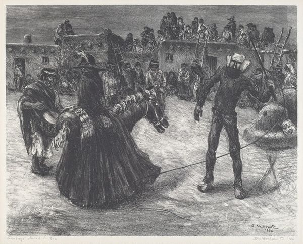 Ira Moskowitz made this print, “The Turtle Dance (Taos),” using careful, precise marks. There’s a real commitment to process here, a building up of the image dot by dot. Look at the tonal variations in the print and how they create a sense of depth and shadow, from the dense foreground to the misty background. The texture of the paper adds another layer of complexity, doesn’t it? Notice the way Moskowitz captures the textures of clothing, skin, and feathers with such delicacy. I love the energy in the drum player’s arms, the wrinkles in his brow, and the detail in the building behind. Each mark feels deliberate, contributing to the overall energy of the scene. This reminds me of Käthe Kollwitz and the way she could invoke emotion with etching. Like Kollwitz, Moskowitz invites us to consider the world through a social lens. Ultimately, art invites multiple readings and interpretations, and it is this ambiguity that keeps the conversation alive.