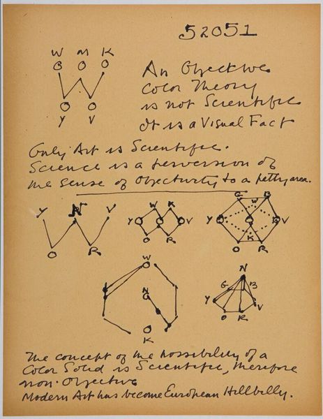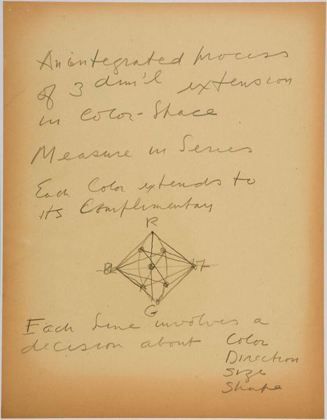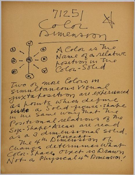 Editor: Here we have Stuart Davis's "Art Theory Text with Color-Solid Diagram." The handwritten text and geometric figure give the piece a very personal, almost journal-like quality. How do you interpret this work? Curator: It seems Davis is grappling with the very nature of color and its connection to emotion and experience. The text speaks of "neighborhoods in the Color-Solid" - a metaphor for the distinct emotional resonances each color evokes. Consider the historical context. Davis, working through the early to mid 20th century, was deeply invested in abstracting the American experience. Editor: So, he’s using color theory to understand and represent the world around him? Curator: Precisely. The diagram isn’t just a scientific tool; it's a map of emotional and cultural space. What does the phrase "artist emotionally selects the one he wants to live in" suggest to you? Editor: That art is about making conscious choices to emphasize particular truths! Curator: Exactly.