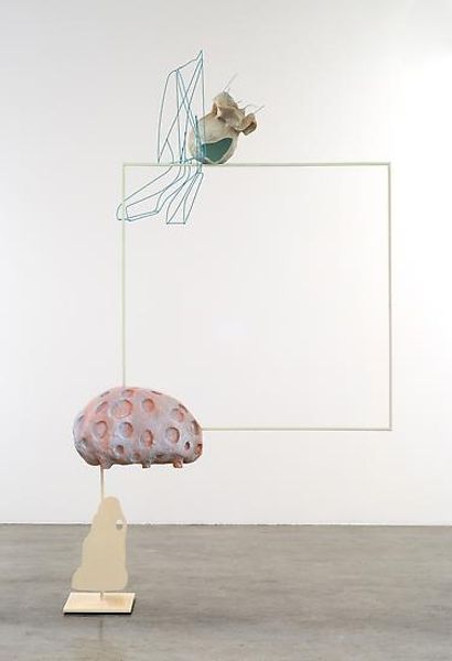 Alfio Giuffrida made this, 'THE ORIGINAL', by doing. It's a doing kind of piece. The wheel, the legs sticking out, it is what it is. What I really love is the way things meet in this piece. The wheel on the pole, the cart with those legs – it shouldn't work but it totally does. It's kind of funny and a little unnerving, right? I mean, those legs, so pale and still, sticking out of that bright yellow cart. It's like a cartoon that suddenly got real. And the whole thing is perched on this pole, like it's trying to be a sculpture, but it can't quite hide its everydayness. It reminds me a little of Dada, you know, where they took ordinary objects and turned them into art just by putting them in a gallery. Except this is weirder, more personal, like a dream you can't quite shake off. It's up for grabs, baby!