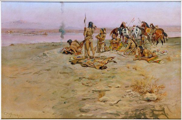 Charles M. Russell created this watercolor painting of a "War Council," employing a traditional medium to depict a scene far removed from European artistic conventions. The scene features a gathering of indigenous people, possibly Plains Indians, in deep discussion. Russell's choice of watercolor, known for its fluidity and transparency, allows for a loose, almost documentary style. This approach emphasizes the immediacy of the scene, giving the impression of witnessing a spontaneous event rather than a staged portrayal. The delicate washes of color give form to the figures and landscape, capturing the subtle light and vastness of the Western plains. The artist’s use of watercolor also mirrors the traditional arts and crafts of the depicted people. The intricate patterns on clothing and blankets suggest careful handwork. Russell's painting thus creates a dialogue between Western fine art and indigenous craft, blurring the lines between observation, representation, and cultural respect. It’s a poignant reminder of the human labor and cultural value embedded in both the subject and the making of the artwork itself.