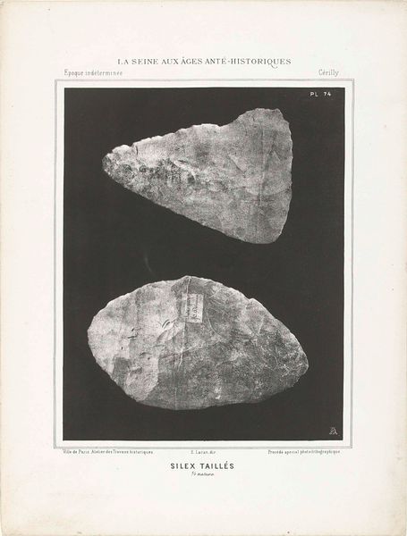 Curator: These lithographs from 1869, titled "Twee prehistorische vuurstenen, gevonden in het stroomgebied van de Seine"—"Two Prehistoric Flints, Found in the Seine River Basin"—offer an interesting, almost clinical depiction of ancient tools. I'm struck by the stark contrast. What are your initial thoughts? Editor: I find it fascinating that these ordinary rocks are presented with such formality. It elevates them somehow, turning rudimentary tools into objects worthy of artistic attention. How do you interpret this work in the context of its time? Curator: From a materialist perspective, this print forces us to consider the means of production, even when the 'artwork' itself predates what we conventionally understand as art. Consider the labor involved: the anonymous prehistoric hand that shaped the flint, the labor of the lithographer in recreating it, the paper-making, the printing press… All contribute to the aura this object acquires. Doesn't this presentation challenge the traditional boundaries between art and craft? Editor: It definitely does. It’s making me think about the societal structures involved in even finding and archiving something like this. What did it mean to document these objects in this way back in 1869? Curator: Precisely. The print becomes a vehicle for disseminating knowledge and shaping perceptions. How are these once-functional objects being transformed into commodities, artifacts of study and wonder, divorced from their original context of human survival and technological advancement? Editor: So, it's about observing the change in the flint itself— from a tool to an object to document? Curator: Yes, in that the value shifts from its function to its representation. The image encourages us to ponder not only prehistoric labor, but also the later labor of classifying, cataloging, and ultimately consuming the past through images like this. Editor: That's a perspective I hadn't fully considered. I was focused on the contrast of "ordinary rock" and "formal art," but this dives into all the implications of it being art. Curator: Indeed. It’s a reminder that even depictions of seemingly simple objects can reveal complex networks of labor, materiality, and social value.