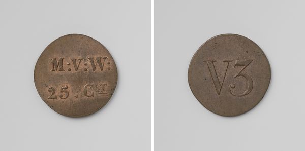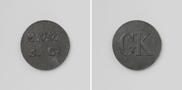 Curator: Before us is a rather peculiar piece from the Rijksmuseum’s collection. It's a house coin, minted between 1818 and 1859 by the Maatschappij van Weldadigheid for the Veenhuizen penal colony. Editor: It’s unassuming, almost stark in its simplicity. The monochrome metal and plain lettering project a solemn and utilitarian aesthetic. Curator: The austerity absolutely reflects the environment it was intended for. Veenhuizen was not just a prison, but also an attempt at social engineering, a place where the poor and orphaned were meant to be "re-educated" through forced labor. The tokens were created to be used as internal currency within the colony. Editor: It’s fascinating how such a basic design reflects deeper issues of control and containment. On one side, we have 'M.V.W.' and '5. Ct,' representing the Maatschappij van Weldadigheid and the five-cent value, while the other shows a V3, likely denoting the "Derde Gesticht," or Third Establishment. It is intriguing how the creators sought order through concise representations. Curator: Exactly! These weren't regular citizens freely engaging in commerce. They were disempowered people living within a very strict system, whose interactions with the outside world and with each other were restricted through money. Editor: It speaks to how systems can influence daily life and individual psychology. Though only small, the coin acted as a regulator within a microcosm of power. Curator: And these pieces allowed the Maatschappij van Weldadigheid, in part, to dehumanize the individuals, who, rather than be engaged citizens, had to conduct themselves under limited access to commodity. They were subject to financial regulations set forth in this manufactured state of social welfare. Editor: It’s a poignant illustration of form following function. These tokens embody an isolated reality, where basic visual components symbolize institutional power, confinement, and social discipline. The weight, material, and design convey that message, if inadvertently. Curator: By visually stripping back ornament, one could say that such pieces invite us to confront our own systems of value and social welfare with honesty, even critique, concerning who they truly serve and at what price. Editor: Indeed. It proves the depth that can exist in even the simplest of forms; it reminds us to read deeper.
