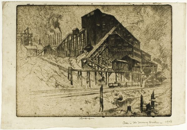 Joseph Pennell made this etching, Old Million Eyes, and the title alone suggests a sense of wonder or dread. The mark-making is so delicate, like whispers on paper, and those closely-packed lines feel like a slow, intentional dance, building something monumental out of almost nothing. What strikes me is the contrast between the industrial architecture and the natural forms. The buildings climb the hill like a rigid, geometric echo of the mountain itself, yet the marks feel handmade, even tentative. Look at the swirling lines that form the sky. They're like a counterpoint to the rigid geometry of the buildings, softening the scene with a touch of the sublime. This print reminds me of Piranesi’s architectural fantasies, but with a distinctly American, industrial edge. It's about the poetry and the terror of progress, I think, and how we find ourselves caught between the two. Pennell shows us that even in the most mechanical of subjects, the human touch can still make things sing.
