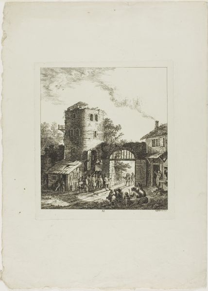 Curator: Let's pause here to appreciate Ferdinand Kobell's "Square Tower with a Gate." It's a masterfully rendered etching, brimming with the details of 18th-century life. Editor: It's so evocative; you can almost smell the dust and livestock. But I'm also struck by how this crumbling structure is still very much a site of commerce and passage. Curator: Precisely! Kobell captures that tension so well. This gate, likely part of an old city fortification, has been repurposed as a marketplace. It reflects the ongoing negotiation between progress and historical weight. Editor: I wonder, too, about who gets to pass through that gate, who gets to participate in this commerce. It's easy to romanticize, but these spaces are always sites of power. Curator: Absolutely. Though Kobell doesn't overtly depict social hierarchies, you can sense them in the composition. The gate acts as both a physical barrier and a symbolic threshold. Editor: It really makes you contemplate how we engage with the layers of history present in our own contemporary spaces. Curator: Indeed, a beautiful, poignant reminder that the past is never truly past.