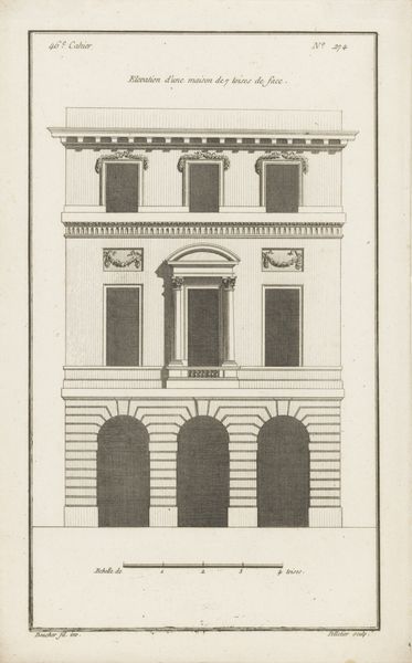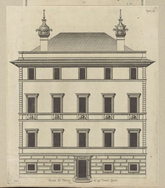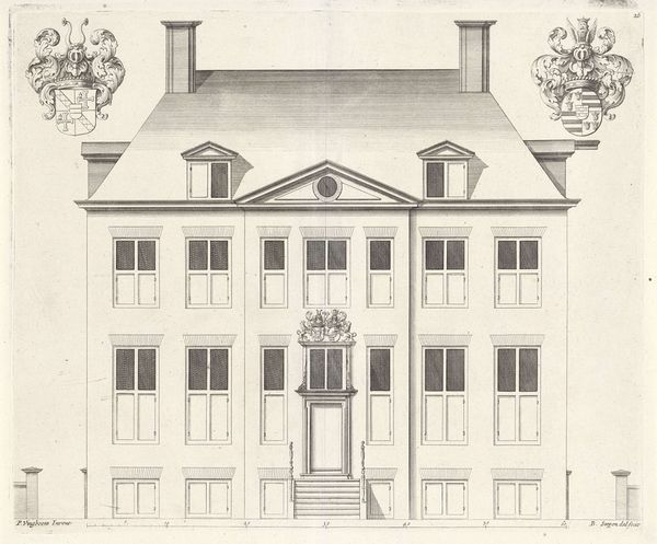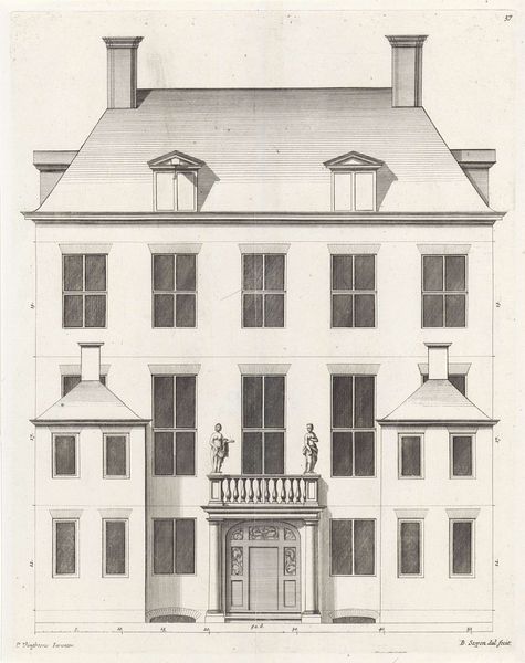 Curator: Here we have Bastiaen Stopendael’s “Facade of a House on the Keizersgracht in Amsterdam,” created in 1674. Look at the intricacy. Editor: Immediately, it feels austere, yet there’s a real beauty in that precision. Almost mathematical. The pale shades make me think of long winters, secrets behind those barred windows. Curator: Well, it *is* an architectural rendering. Stopendael captured this façade with such detail—look at the brickwork he's described through engraving, you could almost build it yourself, knowing the material ratios and processes. The paper itself must've been high quality to withstand such close labor. Editor: Right, there’s such an interesting contrast, isn’t there? This very solid, expensive house, meticulously planned… rendered on delicate paper. It's as if the artist wanted to capture its presence for posterity. Almost feels melancholic, like he knows it won't stand forever, or those who live there might fade. Curator: And in a way, he did grant it immortality. Through the relatively new technology of reproducible engraving, it could live on long beyond brick and mortar's life cycle. Editor: It's fascinating to think about the socioeconomic implications too; who owned this house, what sort of work financed such a building? Engraving became another extension of mercantile interests. What labor underwrites its existence, both building and reproducing its image. Curator: Absolutely, and Stopendael’s attention doesn’t just highlight the architectural details; it points towards the status and aspiration that owning such a home represented at the time, especially along the Keizersgracht. Editor: Though even as I see its function as an aspirational depiction of wealth, its formal presentation brings out this slightly ghostly essence in my view, its delicate shading hinting at fragility, the shadows behind the barred windows making it feel strangely uninhabited despite its imposing facade. Curator: In essence, it exists now, perhaps, outside time and location. We get to see the details of daily life centuries gone by captured with astounding patience and precision. Editor: Indeed. A record of how we attempt to create lasting impact from temporary matter. It encourages me to wonder what homes from our era will look like to those observing them from similar vantage points in the future.