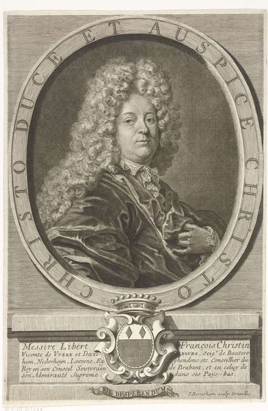 Curator: Oh, he looks like he’s about to share a deliciously wicked secret. What a sly smile! Editor: You're spot on about that captivating smirk. What we're looking at here is "Portrait of Nicolas Boileau Despréaux," dating back to 1710. It’s an engraving on paper by François Chereau the elder and it resides here at the Art Institute of Chicago. Curator: Ah, engraving – makes sense with that fine web of lines creating light and shadow. I can almost feel the texture of his wig, the plushness of his jacket! The precision is incredible, as is his expression. He looks so self-satisfied, yet approachable. Was this a popular way to circulate portraits? Editor: Precisely! Engravings like this made art accessible. Boileau, a prominent literary figure of his time, would have had his image circulated widely. Consider it a 18th-century social media, allowing him to cultivate a public image. Engravings played a crucial role in disseminating not only images of powerful figures, but ideas and aesthetics across society. The popularity of Baroque portraiture created a high demand for printed images, feeding into a growing market for art and printed material. Curator: So, like a profile picture, but make it Baroque? He certainly understands the assignment. I feel like this engraving elevates him, maybe idealizes him just a touch... and yet you see the real man in that expression. It's as though the artist managed to capture not just his likeness, but a whole attitude! Editor: Baroque art certainly has a knack for that theatricality. Note how the elaborate wig frames his face, drawing our eye directly to his expression. The inscription beneath the portrait even adds another layer – alluding to his place among literary giants like Horace. These visual cues underscore his importance and legitimize his status in the intellectual world. It is a reminder of how deeply image, status and influence were entwined in that era. Curator: He knows who he is, doesn't he? A portrait designed not just to remember him, but to make him legendary! I feel I understand the age a little better having seen this print. Editor: Indeed, engravings give us a glimpse into how reputations were made, remade, and circulated, reflecting the ever-changing tides of social and political landscapes. Thanks for noticing the small inscription on the artwork, by the way, as these are easy to miss, but often add layers to the piece in unexpected ways.