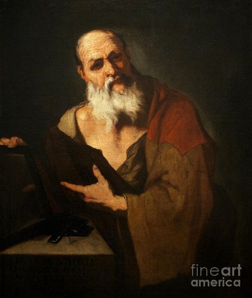 Editor: This is Jusepe de Ribera's "Saint Matthew," painted in 1632 using oil on canvas. I'm immediately struck by the intense contrast of light and shadow. How do you interpret this work? Curator: The stark chiaroscuro immediately evokes a sense of revelation and introspection. Light, here, is not just illumination, but a force that exposes inner truths, would you agree? Consider the book—the Gospel—it is holding. This heavy tome suggests not just knowledge, but a burden of interpretation and communication. Editor: Yes, it seems to hold a great significance! The weight seems to press down on the figure, giving him a weathered, almost burdened, look. Curator: Exactly! It is not only his physical burdens in this world; it reflects also spiritual weight carried by Saint Matthew, the Apostle. Think about what the book means and represents. It's not merely a historical object. Rather, it symbolizes divine revelation, cultural memory, and the transmission of values. Don't you think the play of light seems to almost consecrate Matthew? Editor: Definitely. It draws my eye immediately to the face, the book, and his hands - the focal points in transmitting this important text. The details highlight how the Word becomes materialized through these human actions. Curator: And observe how Ribera used a simple setting – what could that indicate to the viewer? Editor: Maybe the artist aimed to connect more personally to the Saint by portraying his daily human life. Looking at the piece from this angle opens up so much to consider! Thanks!