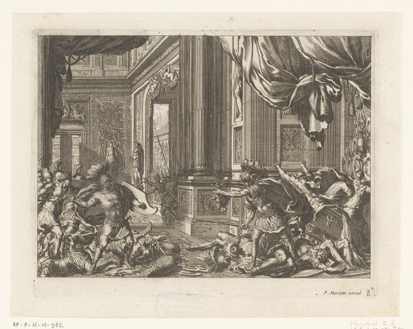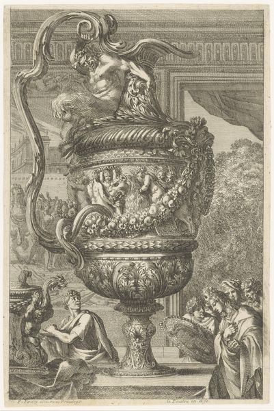 Jean Le Pautre created this print, “Twee schenkkannen,” sometime in the 17th century. Le Pautre was a designer and engraver, working during the reign of Louis XIV, and he was known for his elaborate and fantastical ornamentation. In this print, we see two ornate ewers. The ewer on the left is being supported by a figure. The ewer on the right has been decorated with grape vines. Both are on display for a group of onlookers. The artist uses the image to display wealth and status. These objects signify a particular kind of aristocratic identity rooted in luxury and excess. The print offers a glimpse into the opulence of the French court and the cultural values that shaped the era. Consider how the imagery of luxury and abundance relates to contemporary notions of taste, class, and social identity. Do these objects evoke feelings of admiration, envy, or perhaps even unease?