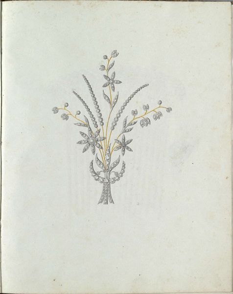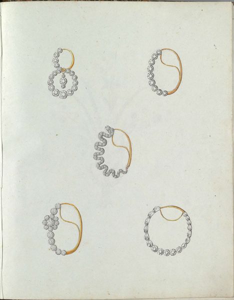 Curator: This delicate watercolor piece is called "Vijf juwelen, waarvan één met een tros bessen," which translates to "Five Jewels, one with a bunch of berries." Carl Friedrich Bärthel created this around 1800-1810. Editor: They’re so enchanting! They have a light touch. These almost look like quick sketches or concept drawings, capturing the light playing on each jewel. There’s an ephemeral quality, as if they might just fade away. Curator: Indeed. Consider how the display and ownership of such items signified status in that period. These jewelry designs reflect not just personal adornment but a statement of social position. The meticulous rendering points towards its possible use in a jewelry catalogue. Editor: I'm curious about the implications of designing jewels, and not showing their wearers. Are we meant to consider these for a specific class, race, or gender? It prompts reflections on the historical contexts and who exactly benefited from these beautiful adornments. The absence of figures becomes striking when thinking about it through a contemporary lens. Curator: Absolutely. During that era, these drawings catered to wealthy clientele, signifying luxury and exclusivity, mirroring and solidifying social structures and political hierarchies. The subtle rendering in watercolour enhanced the perceived value. Editor: Watercolors allow this feeling of being unfinished. The jewels appear delicate, precious but simultaneously vulnerable. How subversive would it be to take ownership of a form that visually encapsulates oppression and turn it into a message of power for those originally disenfranchised? It forces me to grapple with art as both a reflection of inequality and a possible site of change. Curator: I concur. Bärthel's "Five Jewels," initially just beautiful jewelry depictions, become symbols of a layered and challenging past through our discussion. Editor: Agreed. Viewing artwork with awareness allows for both critique and transformative reimagining, bringing vital historical dialogue into modern understanding.