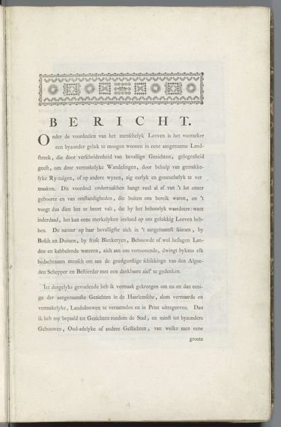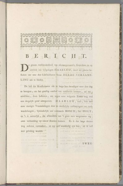 Editor: Here we have "Derde brief over het bedrog van de windhandel, 1720," a print on paper created in 1720 by Isaac Stokmans. The typography gives the work an antiquated, almost official feeling. The content appears critical. How do you interpret this piece, looking at its symbols and imagery? Curator: The “windhandel,” or literally “wind trade,” points to speculative economics – businesses built on air, fleeting and insubstantial. Observe how the central text highlights "de opkomst" (the rise) and "de ondergang" (the downfall). Doesn't that create a cyclical feeling, hinting at inevitable boom and bust? What does the ornament representing a vase teeming with vegetal motifs evoke for you? Editor: I hadn't considered that cyclical reading before. The vase perhaps symbolizes abundance or fertility, even prosperity that maybe isn't so "fertile" after all? I do notice the repeated mention of Amsterdam. Curator: Exactly! This visual symbol and typographic element work together. Amsterdam in this period was the centre of global finance. Consider this Stokmans print as a critique, a cautionary tale told through easily disseminated images and text. A tool of public education, would you agree? Editor: That's a compelling thought, I didn’t really appreciate how such accessible art like prints, even if typographic, can capture political or social sentiments so effectively. Curator: Indeed, prints democratized art, bringing symbolic communication directly to the public. Food for thought on how we visually remember and repeat these cycles, isn't it?