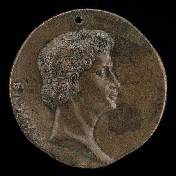Curator: I’m immediately struck by the stillness. This bronze medal, “Lucia Ruspagiari (?)” dates from around the 16th century, and that deep, warm patina just exudes quiet dignity. Editor: Yes, it's interesting how such a small, contained space, the circular boundary, amplifies the feeling of self-possession. Do you think the darkness of the bronze adds to the gravity of it all? Curator: Absolutely. It feels almost like gazing into a dark pool and seeing a face reflected, a glimpse into another time. What symbols are at play here for you? Editor: The laurel or oak leaf securing her drapery seems very Roman; a nod to virtue, strength. And the deliberate, almost severe hairstyle bound up with a simple headscarf points to a society valuing restraint and status. The symbolism creates a sense of decorum that resonates throughout the piece. Curator: It’s a masterclass in miniature, isn't it? It reminds me that portraiture, no matter the size, can pack such a punch! The unknown artist managed to give this Lucia, whoever she was, a palpable presence, an essence that transcends time. There is something that pulls at the corner of my imagination and sets it wandering. Editor: Indeed, it's as if that restrained elegance creates a powerful emotional space around her. What lingers for me is not only her individual identity, but the cultural identity so clearly projected in the artistic style, and even more broadly, that persistent desire to immortalize the human likeness. Curator: The way it plays with light and shadow gives it this very strange, alluring quality that captures your gaze. It makes you ask what sort of legacy will you, or I, leave behind. It speaks of humanity's long, unbroken line. I think that's powerful. Editor: A small object containing a monumental statement about the enduring power of image. Well said.