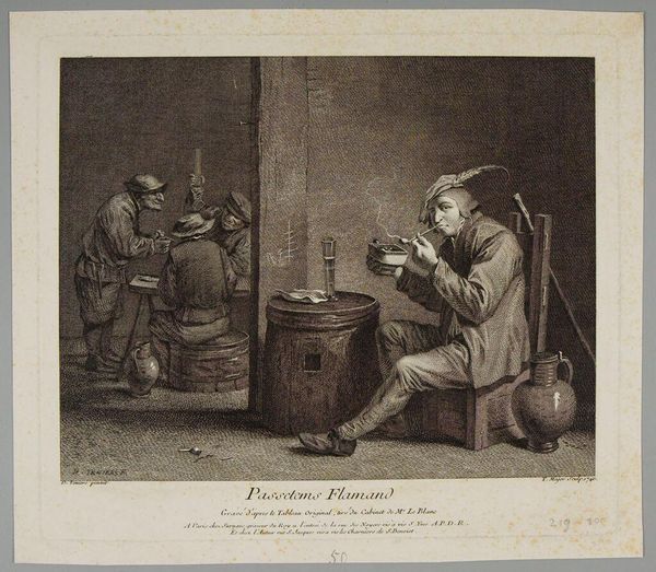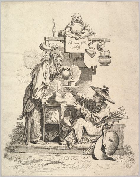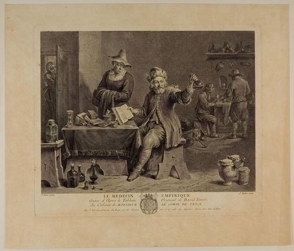 Curator: Jacques Nicolas Tardieu created this engraving, called "Empirical Medicine," sometime around the 18th century. What leaps out at you when you look at it? Editor: Well, there's a certain organized chaos to the scene, isn't there? The quack doctor seems so pleased with himself while everyone else looks dubious. Curator: I find it interesting how Tardieu, as an engraver, is commenting on the state of medicine during the Enlightenment. The print suggests a skepticism toward so-called experts. Editor: Exactly, and the composition reinforces that. The hourglass, the bubbling concoctions, the patient peering from behind the door—it’s all about theatrical display versus genuine care. Curator: It makes you wonder about the role of charlatans and the public's perception of science back then. Perhaps not so different from today... Editor: Indeed. Though the print is small, it holds a mirror up to larger societal anxieties surrounding trust and authority. A timely reflection, even centuries later.