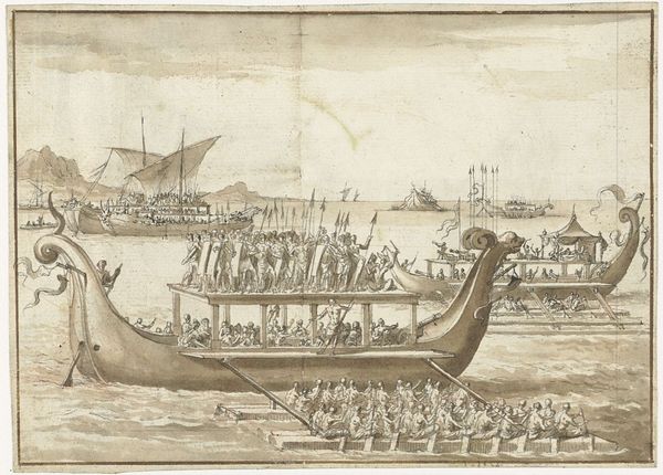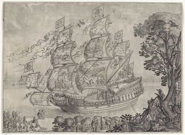 Editor: This is "First Naval Combat" by Jacques Callot. It's an etching measuring about 21 by 30 centimeters. It feels incredibly detailed and chaotic, but also... celebratory? How do you see this work, especially considering its place in history? Curator: The "celebratory" aspect is interesting. Callot's prints, though depicting battles, were often commissioned to glorify military prowess. This print, like many of his others, served a propagandistic function, shaping public perception of naval power and national identity. How might such imagery influence contemporary audiences? Editor: So, it's less about the reality of war and more about the performance of power? Curator: Precisely. The print becomes a form of political communication, reinforcing societal values and justifying military action. It’s crucial to consider the artist's role within that framework. Editor: That's really changed how I look at it. Thanks! Curator: Indeed! Considering art's political dimensions certainly deepens our understanding.