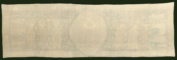 Curator: Immediately, I’m drawn to the evident fragility. You can almost feel the age and the years of slow decay in the fibres. Editor: Indeed. This object, dating from 1570 to 1630, is cataloged as "Fragment of a Ship Flag". It resides here at the Rijksmuseum. Created by an anonymous artist, it’s an exquisite watercolor and textile piece. Curator: A ship flag, yet so earth-toned and faded. What would have compelled this choice of medium? It's grandeur and authority, rendered on fragile, absorbent cloth, watercolours seeping into fibres...it's about the symbolism isn’t it? What does that imply? Editor: As a materialist, I'm wondering about the labour, the means, of producing such a large piece of textile art. Watercolor as the chosen medium is also curious. I wonder if its apparent 'disappearance' and gentle integration into the cloth alludes to ideas of colonial enterprise as almost ghost-like... a spectre of the age. Curator: It has heraldic symbols, glimpses of crowns, lions, lilies - emblems heavy with the weight of history, dominion and power. These symbols persist. They echo through centuries, carrying meaning. What does that pillar mean to you? 'Plus Ultra,' 'Further Beyond'? Editor: ‘Plus Ultra’, beyond, onwards – the motto associated with Habsburg Spain and the so called 'age of discovery'. Watercolors are transportable, impermanent… perhaps the fragility itself speaks to the transient nature of imperial projects and aspirations, a conscious acknowledgement of inevitable decay in a world dominated by material excess and resource extraction. Curator: So, even in decay, it presents us with something profound, then – the illusion of permanence exposed. The banner might fall but its idea, or more properly its ideas - its ghosts - remain in the cultural landscape. Editor: Right. The flag is the literal artefact that points to those colonial-era industries. I would be intrigued to better know more about the textiles’ origins: Was it locally produced, or an imported luxury, signifying wealth? Curator: Ultimately, viewing “Fragment of a Ship Flag" reveals to us both an artifact of past power, and a ghostly premonition, rendered in delicate colour, reminding us that power and meaning reside long after their initial material conditions disintegrate. Editor: Exactly. I'm now looking beyond the artwork, contemplating all of the various processes and labours required for even just the creation of this now aged piece of textile, stained with pigment from an unknowable past.