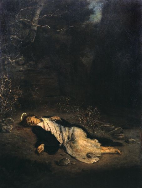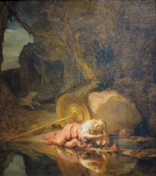 Editor: We’re looking at Eugène Delacroix’s "The Death of Ophelia," painted in 1838. The oil painting presents a somber and melancholic scene. What strikes me most is how passive and vulnerable Ophelia appears within the vast landscape. How do you interpret this work? Curator: The painting resonates powerfully when considered within the context of gendered representation in art history. Delacroix’s Ophelia, adrift in her final moments, becomes a symbol of female fragility and the tragic consequences of societal constraints. We have to ask, what commentary is Delacroix making about female identity in a patriarchal society? Editor: I see that. The darkness of the surrounding forest and water definitely adds to the feeling of being trapped. Curator: Exactly. The romanticized ideal of Ophelia’s madness and death often overlooks the violence inflicted upon her – both by Hamlet and by a society that silences female voices. It encourages us to examine how artistic depictions reinforce or challenge societal norms and to seek a deeper understanding of the narrative's power dynamics. Do you see any symbolism relating to female oppression here? Editor: Now that you mention it, the way the surrounding nature almost engulfs her feels like a visual metaphor for the overwhelming forces acting upon her. It feels…intentional. Curator: Precisely. The painting can be considered an indictment of the conditions that lead to Ophelia’s demise. Through visual analysis and contextual understanding, it enables us to critically assess representations of women in art and their relevance to contemporary discussions about gender equality and empowerment. Editor: That’s a perspective I hadn’t considered. It's interesting how much more there is when considering the social and historical implications within the painting. Thanks for this insight! Curator: Indeed. It’s by weaving these diverse narratives together that we uncover the deeper meaning and impact of the art.