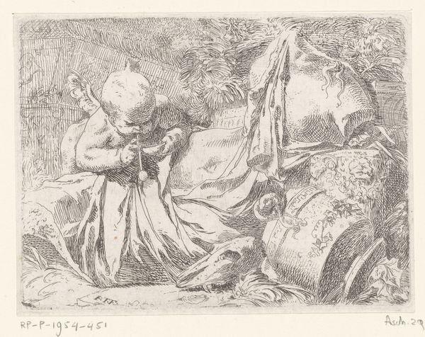 This anonymous etching, titled "Seated Soldier," was created in the Netherlands at an unknown date. It portrays a soldier in repose beneath a tree. The image’s meaning emerges from the historical context of the Netherlands, a region marked by frequent conflicts, particularly during the Eighty Years' War. This conflict shaped a culture deeply intertwined with military service. The print hints at the psychological toll of war. The soldier is alone, seemingly exhausted, and lost in thought. His posture and surroundings suggest a moment of vulnerability, a stark contrast to the typical heroic representations of soldiers. Understanding this image demands that we look into the cultural significance of military service in the Netherlands, the role of printmaking in disseminating political messages, and the contemporary attitudes towards war and its impact on individuals. By researching these elements, the artwork reveals its commentary on the social realities of its time. It critiques the glorification of war, offering a poignant glimpse into the human cost of conflict.