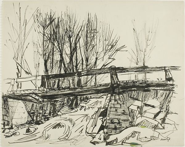 Curator: This sketch, executed in pen and ink by John Marin in 1904, is titled "Annie Byrnes." Editor: It has an immediacy, almost journalistic, like a reportage sketch. What's striking is how much information he conveys with so few lines. Curator: Absolutely. Marin, even early in his career, captured the bustling urban environment. He focused on its dynamism through representations like this, a visual shorthand reflecting the rapid changes reshaping cities at the turn of the century. It's almost an Impressionistic rendering in ink. Editor: I’m especially drawn to the lettering on the tugboat or ferry itself, "Annie Byrnes". Given the era, ship names held potent symbolism often tied to loved ones, important figures, or aspirational ideals. There is an intensely sentimental feel. Curator: That’s insightful. Vessels did embody connections and status, echoing personal narratives, business affiliations or societal roles during maritime’s prominence. It could be someone significant for Marin or possibly a prevalent name in shipbuilding. I am drawn to that little narrative about ordinary commerce and ordinary lives going on with no awareness of its impact to us decades later. Editor: And observe the almost skeletal quality of the sketched figures; they become allegorical representatives for city-goers hurrying across bridges and boarding ferries— anonymous individuals caught within industry’s accelerating current. Their insignificance contrasts intensely alongside vessels' symbolic importance suggesting bigger-than-human powers. Curator: Good point. The contrast accentuates this sentiment and resonates in light of shifting urban demographics within booming industrial and immigrational spheres within America during that epoch. It almost shows us people feeling uprooted from their homes by circumstances that make up our world. Editor: A potent, multifaceted perspective on fleeting urban realities. It offers insight into both collective experiences interwoven within historical contexts along symbolic overtones captured swiftly via simple linework which stands testament still even against this age to social and political echoes permeating day by day for generations since creation. Curator: It indeed stands testament encapsulating fleeting energies embedded now still thanks also greatly towards one great observant artist amidst the rapid transformation around society; giving enduring power within the lines about society always at continuous reshaping with change across ages!