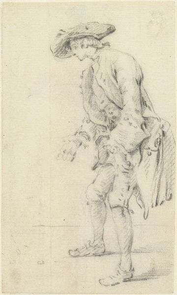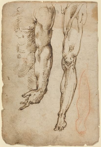 Eric Hebborn created this pen and brown ink drawing called 'A Standing Male Nude (Parentino Imitation)'. At first glance, one sees a classical figure rendered with delicate precision, evoking the Italian Renaissance. The composition is striking. The artist uses diagonal lines and cross-hatching to define the musculature and volume of the nude figure. The dramatic tension is enhanced by the contrast between the detailed, shaded body and the stark, hatched background. This hatching gives the form depth, but also serves to flatten the image, creating a dynamic interplay between the illusion of three-dimensionality and the two-dimensional surface. Hebborn’s choice to imitate Parentino places the work within a complex web of art historical references. By mimicking the style of an earlier artist, Hebborn engages with ideas of originality, authenticity, and the very nature of artistic creation. The imitation questions the concept of fixed meanings. It invites a reconsideration of how we perceive and value art, challenging the traditional categories of "original" versus "copy".