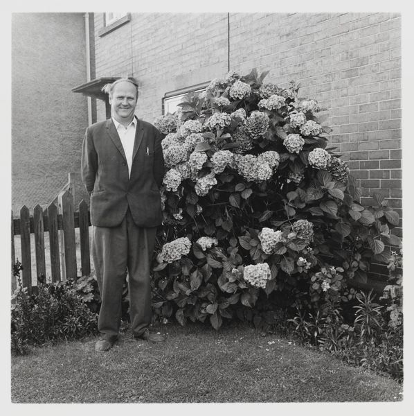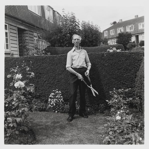 Editor: Keith Arnatt's black and white photograph, "Gardeners", shows a man standing in a garden. It feels very staged, almost like a theatre set. What symbols do you see here? Curator: Note how the pruned bushes mimic human forms seated on the bench, contrasting sharply with the natural, blooming flowers. Consider how this duality, the controlled versus the wild, reflects humanity's age-old negotiation with nature. Does it remind you of any myths or folktales? Editor: I see what you mean. It’s like a modern-day allegory. Curator: Exactly. Arnatt presents us not just with a garden, but with a carefully constructed narrative about order and chaos. The gardener almost blends into the brick wall, doesn't he? A part of the structure. Editor: It makes you think about our role in the environment, and what we choose to cultivate or suppress. I will certainly remember that! Curator: Indeed! And the photograph itself becomes a symbol of that very act of cultivation and framing.