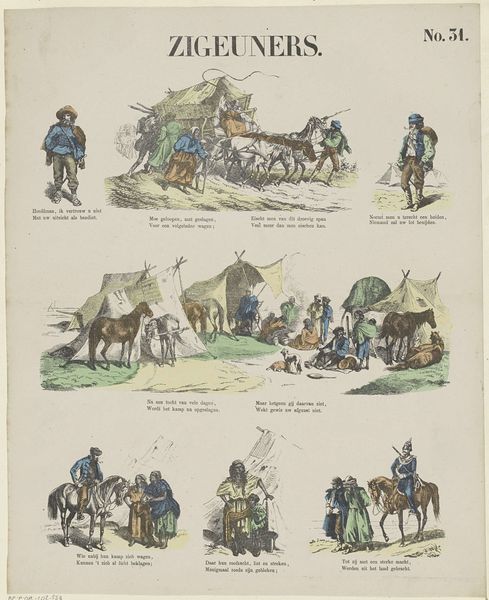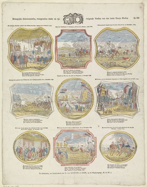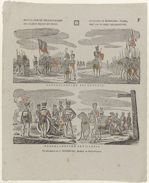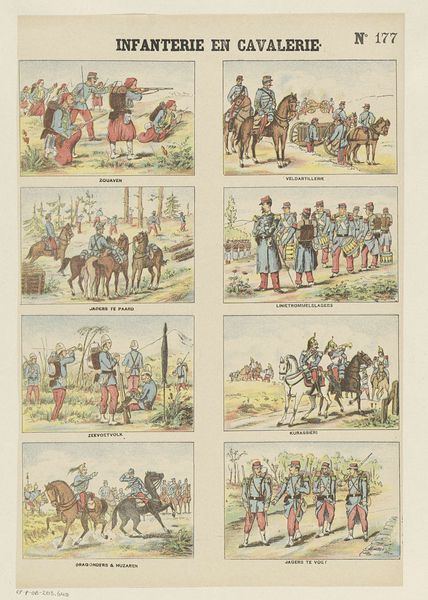 Curator: Glenisson and Van Genechten's "Nouvel alphabet militaire / Nieuw militaire alphabeth," created between 1833 and 1856, offers a curious glimpse into military life represented in a childlike visual language. Editor: It strikes me as almost dreamlike, in the way it flattens the seriousness of military themes. The figures and scenes, though seemingly depicting aspects of army existence, carry a surprisingly gentle, naive quality, like a storybook illustration turned sociopolitical commentary. Curator: Yes, the image seems like a military primer but also transcends straightforward didacticism. This work employs a romantic style—evident in the idealization of everyday life that can carry strong nostalgic connotations and an implied narrative for each letter. It offers this as part of a genre painting, blending instruction with artistic license. Editor: I notice a tension inherent in an "alphabet" for military life that, even when meant to instruct, inevitably hints at the violence and order required in wartime. Does each scene underscore discipline and hierarchy, reinforcing certain ideologies of power? I wonder who its intended audience was; it reads as though there are social critiques, considering military power in public consciousness and broader intersectional narratives. Curator: Potentially. I think the appeal comes from the symbols: for instance, the figures atop the page present the "cyfers chiffres"—digits, where number seems personified. Or the "klinkers voyelles"—vowels where 'A' introduces Algeria: Each is embedded with meanings that shape a cultural understanding of military power. Editor: It’s fascinating how they translate abstraction into approachable visual metaphors, creating symbolic relationships to war through relatable vignettes. By distilling such a vast, complex institution to small visual units and relatable narratives, does this reinforce or demystify military life? Curator: It is a reminder that symbolic visual languages, be it allegories, signs, or narratives, work on multiple layers. There is what it seems to represent—an alphabet, teaching aid. Then there's what its historical context lends it—sociopolitical reflections. Editor: Exactly! So much to contemplate how visual information transmits value-laden lessons. Curator: I appreciate the nuanced reminder of layers beyond visual. Editor: And how our interpretations shift in dialogue across history.