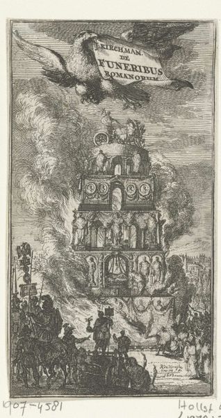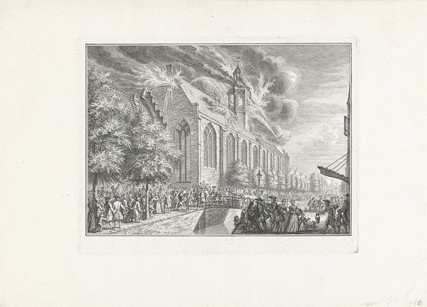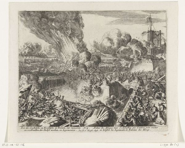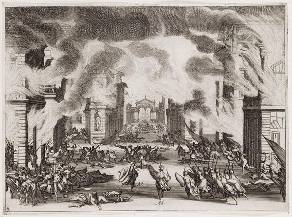 Editor: Here we have Jacques Callot's "Il Solimano, Act IV". The scene is chaotic, rendered with such precise lines that it almost feels like a stage set collapsing into violence. What do you see in this piece? Curator: The composition is striking. Callot uses the etching medium to create a dense network of lines, almost mirroring the disarray of the scene itself. Note the systematic rendering of depth – how architectural forms frame the foreground’s carnage. Editor: So the architectural elements serve a purpose beyond just setting the scene? Curator: Precisely. They are not merely backdrop, but structural devices. Consider how the flames both disrupt and highlight these forms. They embody the tension between order and chaos, a dialectic central to the artwork. Editor: I hadn't considered the flames as a structural element, that's fascinating! Curator: Indeed. Examining the piece through this lens enriches our understanding.
