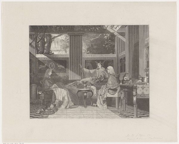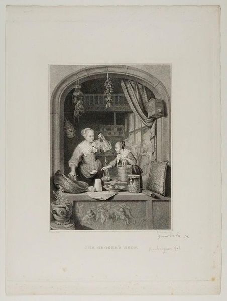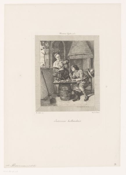 Curator: This is Dominique Sornique’s, “The Delights of a Tabagie.” Editor: It feels like a snapshot into another world. A very smoky world. The etching feels intimate, crowded, and a little secretive. Curator: It depicts a tobacco den. Notice how the artist uses the figures to create a sense of immersion. The imagery suggests a gathering around ritual, perhaps even a rebellion against social norms. Editor: Yes! The pipe is a powerful symbol of communion, a shared experience outside the strictures of society. Do you think the illegibility of the plate's inscription adds to the air of mystery? Curator: Undoubtedly. Sornique captures the essence of social spaces, and the politics of imagery surrounding leisure. There is something human and vulnerable, caught in the smoke filled room. Editor: Absolutely. It’s a glimpse into a moment of shared humanity, elevated by its depiction.