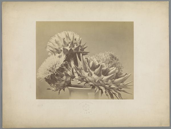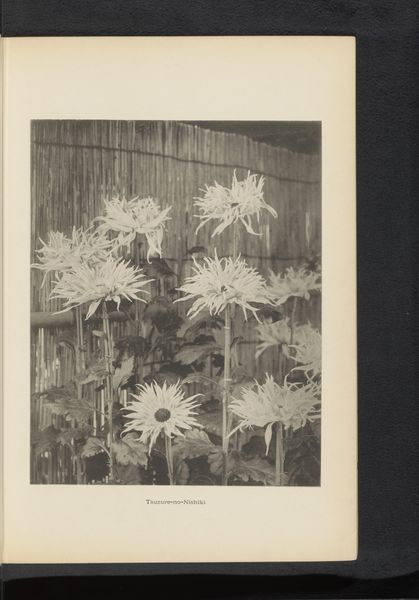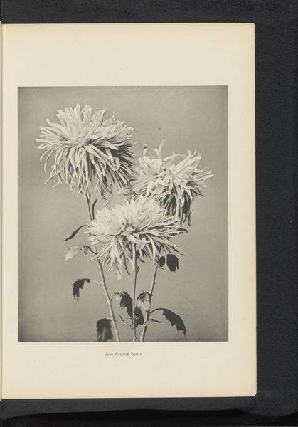 Curator: A photograph, almost ethereal in its presentation, showing a Chrysanthemum plant in full bloom. This is the work of Kazumasa Ogawa, completed before 1896, employing a gelatin-silver print. Editor: It's fascinating; there's a very subdued and meditative quality here. The tones, of course, limit the color palette, but the depth and gradients create a lovely, tranquil surface. Curator: Absolutely, it speaks to the traditional values of Japanese art, where single floral motifs carry profound meaning. The Chrysanthemum, specifically, embodies longevity and rejuvenation in many East Asian cultures. It’s often associated with royalty, even immortality. Editor: One can see that easily – there’s such a careful attention to detail. Ogawa captures every subtle tonal gradation. Even the unfurling buds hint at this future abundance – like potentials ready to unfurl. Curator: Precisely! Beyond the representation of long life, the plant can also represent the seasons. Consider its ability to stand out against the winter snow, symbolizing endurance and beauty in adversity. Ogawa certainly understood its iconic force, placing it firmly in a tradition informed by centuries of history and meaning. Editor: Indeed. The image also reflects Japonisme, which flourished when it was produced and promoted the incorporation of the Eastern visual rhetoric into the visual culture in the West. Looking closer, there’s almost an echo in how the forms branch from one another like the structure of kanji. The linear precision, even without color, conveys the same effect. Curator: Yes, it truly resonates with both artistic discipline and a layered symbolism that reaches back through time, constantly re-interpreted. Editor: A lovely glimpse into not only photographic mastery but also the flower's symbolic depth, urging a richer engagement with an image seemingly so quiet.