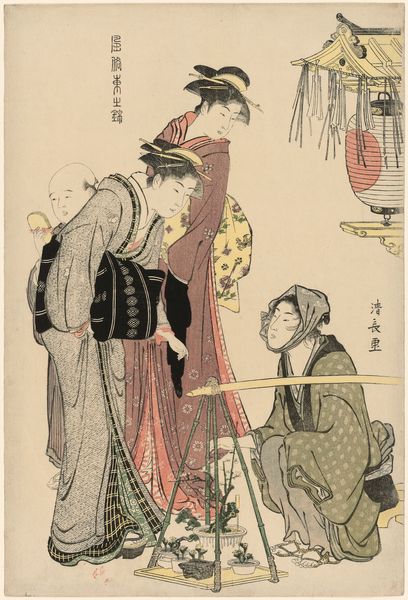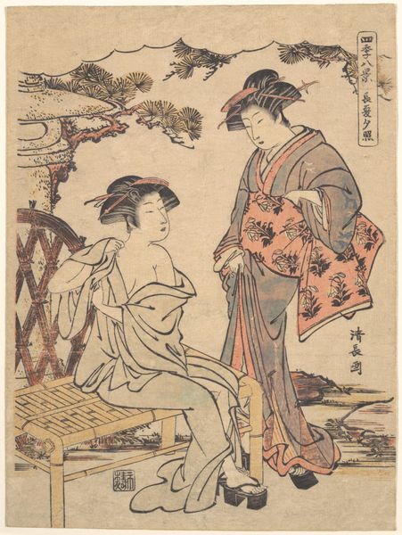 Torii Kiyonaga created this woodblock print titled, *Miyanoshita (Name of One of the Hot Springs at Hakone)*, sometime between 1780 and 1790. It offers a window into the Edo period in Japan, a time of economic growth and relative peace, but also rigid social hierarchies. Kiyonaga, as a member of the Torii school, specialized in portraying the lives and fashions of Edo's courtesans and beauties, known as *bijin-ga*. Here, we see two women in a moment of leisure at Miyanoshita, a celebrated hot spring resort. The details of their clothing, the way they carry themselves, all speak to a carefully constructed image of femininity. However, this idealized representation exists within a society that heavily regulated women’s roles, particularly those in the pleasure districts. The print invites us to consider not only the aesthetic beauty but also the complex realities of women's lives during this era. It’s a depiction of the exterior, the surface, yet it hints at the depths of identity shaped by both personal experience and societal expectations. It makes you wonder about their lives beyond the picturesque scene.