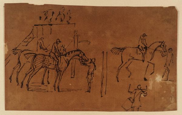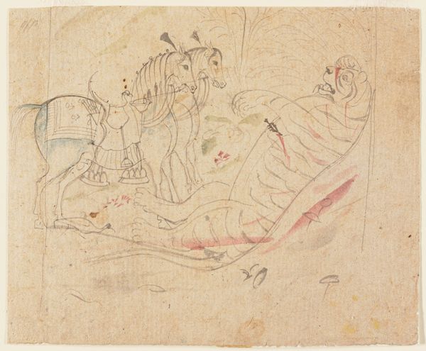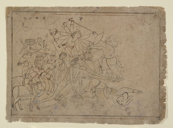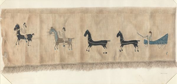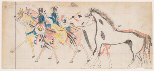 Editor: Here we have "Swift Dog Strikes an Enemy," created between 1875 and 1885 by Swift Dog, using watercolor, ink, and colored pencil on paper. The flatness and linear quality give it almost a feeling of controlled energy, like a snapshot frozen in time. What's your interpretation? Curator: Note the considered use of line, primarily. The contour lines defining the horses and figures create dynamic forms, and how these forms intersect. Observe the limited color palette; the restrained application amplifies the visual impact of the action depicted. Consider also the compositional choices—the positioning of figures within the frame and the use of negative space. How do these choices influence your reading of the piece? Editor: I see what you mean about the lines; they do create all the movement. But it's interesting that the colours are very separate blocks rather than blended at all. It makes the scene almost...abstracted? Curator: Precisely. Note also that the abstraction directs focus to the conceptual. The interplay of form and color creates an intriguing tension. Do you perceive any particular rhythm or pattern in this juxtaposition? How might that relate to your understanding of its theme? Editor: I think I see...the horses kind of mirror each other with their leg positions. The separate colors almost do the same thing. So it adds a sense of controlled, balanced chaos? Curator: An insightful assessment. The careful balancing of forms and colors underscores the deliberate nature of the composition, enhancing the artwork's visual narrative. What did you find most compelling? Editor: I now appreciate how seemingly simple lines and colour choices construct such a vigorous scene and underlying structure. Thanks for that close looking. Curator: My pleasure. Remember, art offers multifaceted layers to decipher with careful observations.