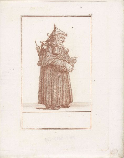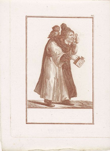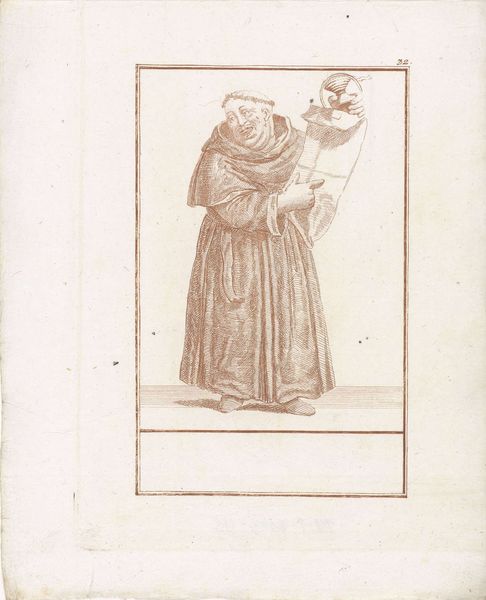 Curator: Jacob Gole's engraving, "Monnik met afgesneden beurs" from 1724, depicts a monk holding a severed purse. The work is currently held in the Rijksmuseum collection. Editor: My immediate reaction is one of bemused darkness. The fine lines create a grotesque caricature, almost like a page ripped from a book of naughty satire. There's an uneasy humor about it. Curator: Considering Gole's background in the printmaking milieu of the Dutch Golden Age, it's important to recognize how engravings like these circulated commentary on social issues, targeting perhaps clerical corruption or the illusion of piety. The material—the very paper and ink—facilitated the rapid dissemination of such critiques. Editor: The stark composition guides the eye immediately to the severed purse, then to the monk's face. The textures, especially in his cloak, show expert use of hatching to define form with very little tonal variation, almost like architectural rendering. There's a fascinating interplay of light and shadow that contributes to the dramatic flair typical of the baroque style. Curator: Right. And that dramatic effect was calculated, designed to resonate with a specific, emerging consumer class eager for moral and political commentary. The production of these engravings speaks directly to a demand fueled by changes in economy and readership, wouldn’t you say? Editor: I'd agree to an extent. The subject, this satirical portrayal of a potentially corrupt figure, is certainly what provides the primary draw for viewers. But looking at Gole's rendering, notice how the gaze is captured: the specific expression and composition make the monk both pitiful and despicable simultaneously. I suppose the point is that form underscores and amplifies the social narrative you are describing. Curator: Fair enough. It's a stark image no matter how one approaches it, from a materialist perspective, considering the engraving as a mass-produced commentary, or through the lens of formalism, emphasizing Gole’s use of line, tone, and composition. Both point towards the social function of art, if only implicitly. Editor: Precisely. Regardless of our different approaches, analyzing this work proves insightful because it provides valuable glimpses into not only period craft and technique but into humanity’s unchanging anxieties and concerns as well.