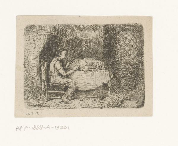 Theodoor Verstraete created this etching, Vrouw zittend bij de haard, using a metal plate, acid, and ink. It is a relatively reproducible image, yet it carries a potent sense of immediacy. Etching allowed artists like Verstraete to translate the qualities of a drawing into a print. The metal plate is coated with a waxy, acid-resistant substance, and the artist draws through this coating with a sharp needle, exposing the metal. Immersed in acid, the exposed lines are eaten away, creating grooves that hold the ink. The plate is then printed, transferring the image onto paper. The result is characterized by a network of fine lines and subtle tonal variations. These are the visible traces of Verstraete’s hand, and also of the chemical action of the acid. The mood is one of weariness, the woman slumped in exhaustion – perhaps a comment on the endless labor of domestic life. We should note that the artist, though deeply empathetic, was not himself engaged in this kind of labor. He observed it. And in a sense, consumed it.
