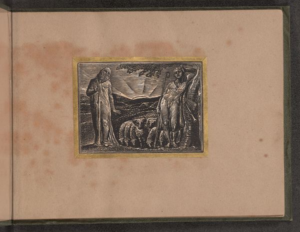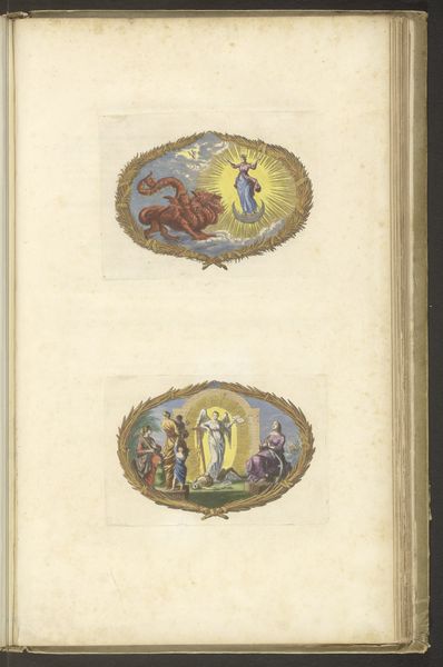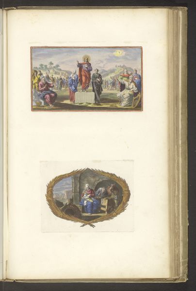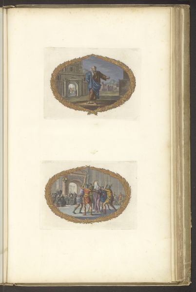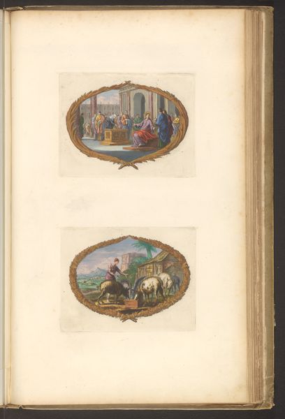Dirk Janszoon van Santen created this page with two vignettes, sometime in the 17th or 18th century, using watercolor and pen on paper. The compositions of each vignette share similar elements, yet diverge in striking ways. Both scenes are framed by identical decorative borders and feature a limited palette of subdued colors. But where the upper scene presents an interior filled with figures in dynamic poses, the lower scene is set in an open landscape, populated by fewer, more statuesque figures. This contrast in setting creates a visual dialogue between enclosure and openness, interiority and exteriority. The composition in the upper vignette, dense with its multitude of figures, lends itself to a reading of communal activity, possibly an audience before a royal figure. In the lower vignette, the three figures are turned towards the sun, suggesting an alignment with natural order. The vignettes operate within a semiotic system where the viewer is invited to interpret the relationship between the symbolic framing and the contrasting scenes within, creating a dynamic interplay between form and content.