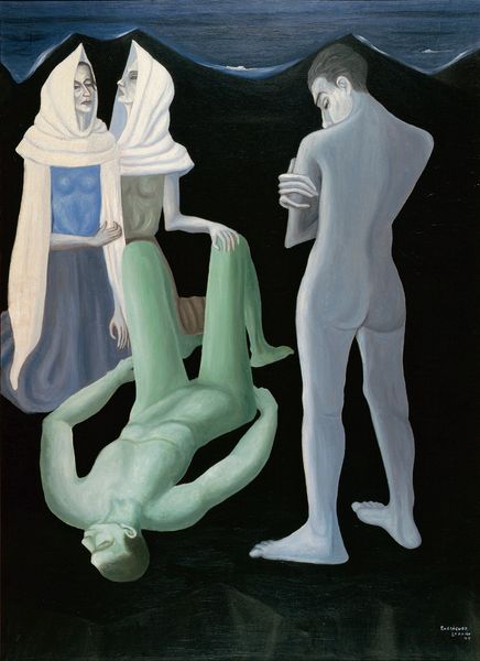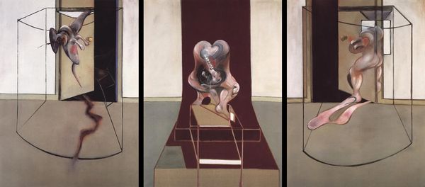 Curator: Figures in Movement, painted by Francis Bacon in 1973. What do you make of it? Editor: Pure anxiety, wouldn't you say? Those figures seem to be disintegrating even as they're trying to...what, flee? What is going on there? Curator: Let's consider the materials. Bacon’s distinctive application of oil paint—the texture, the way he builds up layers, scrapes them back, distorts the human form—it's all a part of expressing modern alienation through the very act of making. The canvas is not merely a surface but a battleground. Editor: A battleground, yes, absolutely! And look at that shoe casually placed behind the figure on the left, seemingly untouched by the turmoil of the rest of the scene! It makes me feel as if a play is starting where there is only enough budget for most of the elements of a scene. Curator: He often incorporated found images – newspaper clippings or photographs— into his works, literally embedding pieces of reality and sometimes a map, as we can see at the bottom, within the constructed space of the painting. He challenges the autonomy of the art object. The labor and source material behind its fabrication become part of the reading. Editor: Absolutely, but the figures also suggest classical statuary, even Greek ideals... yet, filtered through Bacon's tormented vision. What is he doing trying to paint figures, when the reality of being is so far away from any ideals. It also reminds me how it is difficult to create anything out of something broken, you will always be battling the pre-existing properties of something broken. Curator: We must remember Bacon's influences - Muybridge's photography and its treatment of motion. By acknowledging such predecessors, Bacon’s paintings underscore art-making as a cumulative and inherently collaborative process that extends far beyond the studio, connecting creative and intellectual fields, while at the same time being deeply introspective and almost isolated. Editor: Introspective for sure. A map of Bacon's internal geography, perhaps. Thinking out loud is rarely pretty or neat...and that's the case here as well! Curator: A suitable final thought indeed; thank you for sharing that with me, let us move on.