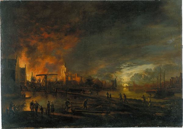 Egbert van der Poel captured the devastating Delft explosion of 1654 with oil on canvas. The scene is dominated by the ominous cloud rising from the ruins, a powerful symbol of destruction and chaos. Consider the ever-present imagery of the apocalypse. The Book of Revelation, painted by countless artists, shows a world consumed by divine retribution, often visualized through fire and crumbling structures. Van der Poel's scene echoes this motif, but without overt religious symbolism. Instead, we witness a secular apocalypse, a disaster born not of divine will but human fallibility. Note the fleeing figures in the foreground. Their frantic movements and expressions of terror represent humanity's primal response to catastrophe. This gesture of flight is an archetype, seen in depictions of natural disasters throughout art history, conveying intense emotional states. Like a recurring nightmare, such images tap into our collective anxieties about mortality and the fragility of civilization. The symbol of destruction resurfaces repeatedly, echoing through time, each instance reflecting and reshaping our understanding of catastrophe.