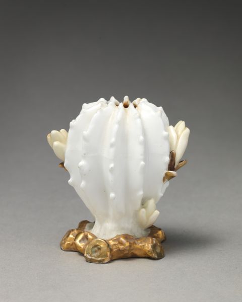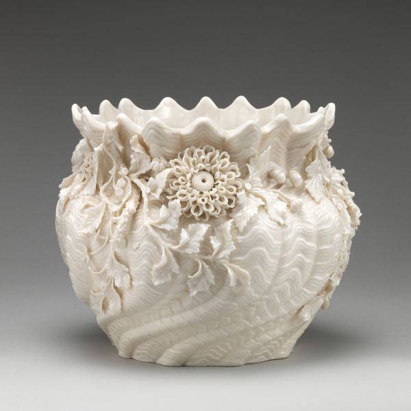 Curator: At first glance, I’m immediately drawn to the swirling pattern. The use of light and shadow to accentuate the spiral creates a captivating sense of depth and movement. Editor: Indeed. What you're describing has a great deal to do with Wedgwood's early 19th-century fascination with marine life, exemplified here in this “Wall Pocket,” a ceramic earthenware piece from around 1805. Curator: "Wall Pocket," you say? A wonderfully utilitarian form! Yet the transformation of such base materials into a decorative object for the home is quite fascinating. Editor: Absolutely, consider that Wedgwood, as a factory, aimed to elevate ceramic production beyond mere functionality. By perfecting industrial techniques, they managed to replicate natural forms in an accessible, affordable way. Note the delicate pink-purple glaze that adds a whimsical touch to an otherwise rigidly formed shell. Curator: A calculated whimsy, wouldn’t you agree? The rococo flair is certainly not accidental. I can’t help but appreciate the conscious manipulation of the spiral to produce a feeling of forward movement, which gives this stationary object the impression of dynamism. Editor: The form follows the fashion and style of its moment. But beyond the visual pleasure, this object is a material testament to the labor practices of its time. Each curve speaks to the industrial precision but also of workers tasked with recreating nature according to Wedgwood's aesthetic vision. It straddles a line between industrial efficiency and decorative artistry. Curator: So while it serves as a kind of vessel for displaying floral arrangements, the ceramic "Wall Pocket" contains deeper levels of meaning within its form. Its beauty, while seemingly simple, evokes dialogues around nature, industry, and aesthetic representation. Editor: I concur entirely. When assessing historical production, there must be careful consideration of the hands and processes behind such alluring consumer items, like this objet d'art, a seemingly benign “Wall Pocket." Curator: Indeed, thinking about the cultural value invested into seemingly quotidian objects provides a rich viewing experience and prompts new avenues of appreciation for material culture.