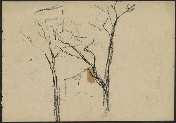 Editor: This is "Bomenrij," a drawing in ink on paper by Willem Witsen, dating from around 1870 to 1923. The starkness of the trees against that sketchy background creates such a melancholic atmosphere. What do you see in this piece, beyond just a row of trees? Curator: For me, it speaks volumes about humanity's relationship with nature, especially during a time of rapid industrialization. These trees, rendered in such a raw, almost desperate way, could be seen as a metaphor for the pre-industrial world, struggling to survive amidst the rise of factories and urban sprawl. Does the composition evoke any specific power dynamics to you? Editor: Hmm, I hadn't thought about it that way. Now that you mention it, the way the trees are almost huddled together, and the sketchy lines above them – they seem vulnerable. The background almost feels threatening. Curator: Exactly! Think about the social context of the late 19th century. Urbanization led to displacement, alienation, and a yearning for a lost connection with the natural world. Witsen, part of the Amsterdam Impressionism movement, was acutely aware of these shifts. What do you make of his choice to use such minimal materials—just ink and paper? Editor: It amplifies the sense of fragility, doesn’t it? An elaborate oil painting might have felt too grand, too detached. Ink on paper brings a sense of immediacy and directness, almost like a cry for help. It makes me think about environmentalism today, and how artists continue to use simple means to deliver powerful messages about the climate crisis. Curator: Precisely. Witsen’s work serves as a poignant reminder that the anxieties we face today regarding our environment and place in the world are not new. It underlines the ongoing dialogue between art, history, and the critical need for social and environmental justice. Editor: This has really opened my eyes. I appreciate how the piece operates on a level deeper than just depicting landscape. Curator: And I believe your interpretation perfectly captures the work’s essence; it becomes so much more profound when viewed through a contemporary lens of environmental awareness and social concern.