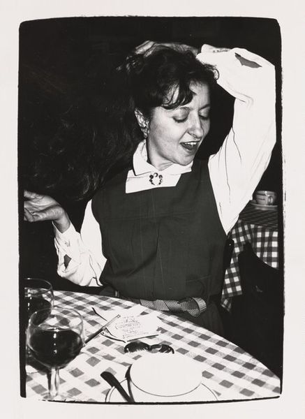 Editor: This photograph, titled "Elizabeth Saltzman and Unidentified Man," is by Andy Warhol. It's undated but likely from his later period. The immediate impression is quite intimate; a black and white snapshot quality. What do you see in it, looking beyond just the image? Curator: Beyond the immediate depiction, I consider Warhol's relationship to photographic materials. This isn't about 'high art' photography in the traditional sense, meticulously composed and printed. It's a mass-produced object. The snapshot aesthetic, the use of black and white – it all speaks to accessibility and the democratisation of image-making, a challenge to established hierarchies in the art world. Editor: So, it's the act of taking and presenting a photo more than its inherent aesthetic qualities? Curator: Precisely. Consider the social context. What sort of event were they attending? Whose labour went into their clothing? Into taking the photo and into producing multiple copies? The work exists within a system of production and consumption that implicates everyone involved, from the subjects to Warhol himself, as a producer, consumer, and celebrity. Warhol is engaging with those systems directly in making art. Editor: The subjects look quite young. Curator: And their clothing reflects trends. The entire event and all of it’s constituent parts - clothes, makeup, lighting - are mass-produced or use mass-produced items, from the department store or the photography supply shop, enabling access and further blurring boundaries between consumer and artistic. It becomes impossible to separate the material realities from the art. Editor: That really shifts my understanding. It's not just a photo of two people; it's about the mechanics and materials behind the moment. Curator: Exactly! The means of production are the subject. We are seeing not just Elizabeth Saltzman and her friend but how cultural forces enable a material reality. Editor: Thanks! I’ll look at photos in a different light from now on!