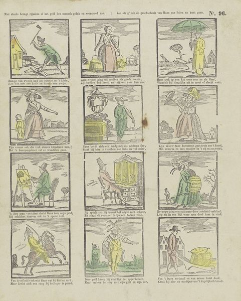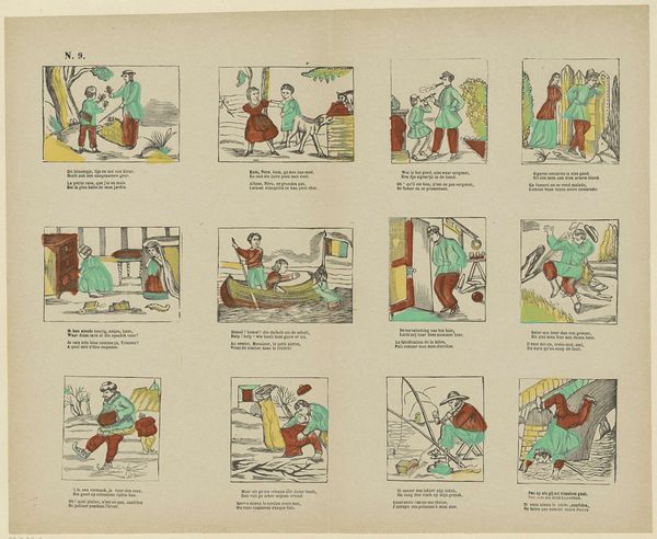 Editor: Here we have "Koophandel en stielen / Commerce et métiers," a print from somewhere between 1866 and 1902 by Franciscus Antonius Beersmans. The print, in its almost diagrammatic presentation, reminds me of a children's book of trades. How would you describe the print's visual construction and organization? Curator: The print showcases a grid-like composition, with sixteen discrete scenes, each functioning as a self-contained unit. The deployment of simple forms, with clearly delineated outlines, highlights an aesthetic which seems deeply invested in conveying its subject matter through form. Each small frame operates independently while participating in the construction of a unified pictorial surface. Note how the blocks of minimal color add another layer of structure. Editor: What's your take on the limited use of color here? Curator: The restrained palette pushes us toward scrutinizing the compositional relationships in play. It serves to amplify the shapes within each scene. Green and red are strategically positioned throughout, constructing a visual echoing effect which is so fundamental to the work. How might this considered design enhance our appreciation of the artisan traditions? Editor: The print definitely elevates these common scenes by highlighting the formal structure of everyday actions. Seeing it this way makes me appreciate that structure can highlight often overlooked aspects of work and daily life. Curator: Indeed. Paying attention to structure grants access to so much of the intention.