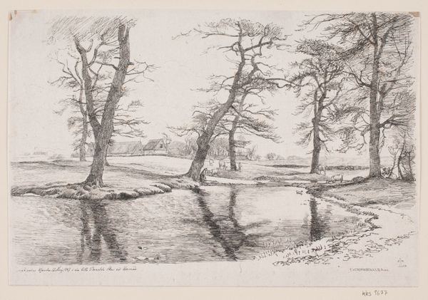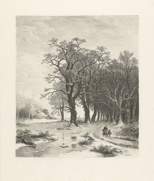 Elias Stark created this print of a snow-covered landscape using etching. Executed during a time of significant change across Europe, it is worthwhile to consider how the image creates meaning through visual codes and historical associations. This landscape invites reflection on the relationship between humanity and nature. The frozen scene could represent the power of nature over human life and the transience of human endeavors against the backdrop of the natural world. Stark was working in the Netherlands, and the Dutch landscape tradition often carries nationalistic meanings, where the countryside is bound up with notions of cultural identity. To better understand this print, we might consult historical records, artist biographies, and critical analyses of landscape art during the late 19th century. Remember that art's meaning is contingent on its social and institutional context.