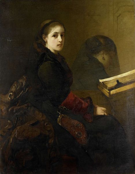 Editor: Here we have what is thought to be a portrait of Emma, Countess of Mount Edgcumbe, rendered in oil paint, potentially by Joshua Reynolds. There's a softness to the brushstrokes, almost dreamlike, and the limited palette lends it an intimate air. What do you see in the composition itself? Curator: I am immediately struck by the chiaroscuro, the strong contrast between light and dark. Observe how the artist strategically employs light to sculpt the Countess's face, directing our gaze. It is not merely representational; rather, it creates a focal point. The cascade of light is integral to how we read the structure. What else about the light strikes you? Editor: Well, the darkness definitely makes her pale skin and clothing pop. But it also seems to flatten the background, making her feel a bit isolated. The lace details around her neckline seem particularly intricate, the way they are rendered. Curator: Precisely. Reynolds expertly manipulates the textural contrasts. Consider the smooth planes of her face against the delicate intricacy of the lace. Note also how the eye is lead from the upper portion of the dress upward toward the face via similar coloration. It underscores not just her social standing, but more importantly the very texture of reality and representation, through paint. This tension adds a certain vitality, don't you agree? Editor: Yes, I see that now. The texture adds so much more to the painting. So, by examining just the formal elements, we can understand much more about this woman's portrait. Curator: Indeed, it's the visual language itself that speaks volumes. Appreciating how line, colour and composition contribute to the whole broadens our understanding, in a historical or artistic context. Editor: This has changed the way I approach portraits from now on.