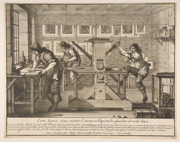 Editor: Here we have "Enigmes Joyeuses pour les Bons Esprits, Plate 5" created sometime between 1610 and 1620 by Jan van Haelbeeck, a print and drawing in the collection of the Metropolitan Museum. The intricate lines defining the weaving machine create a striking composition within a defined, intimate space. What do you notice about the relationship between subject and form? Curator: Note the pronounced linear elements of the loom, stark against the textured suggestion of cloth and produce. How do those competing textures contribute to a unified artistic composition, if at all? And does the contrast of mechanical precision against natural bounty evoke commentary on societal norms of labor versus leisure, or is it merely coincidental to its structure? Editor: That is quite interesting! The juxtaposition of these opposing elements invites a rich and possibly intentional contrast. Now that you mention it, the rigid structure of the loom does command significant attention, doesn't it? Curator: Yes, the orthogonals establish order. It is worth considering whether or not this pursuit of balance extends further. Is it possible to see in the disposition of light and dark a dialogue, an effort to unify elements? How is your eye guided, for example? Editor: I think my eye is guided horizontally along the weft of the loom. It almost acts as a visual path from the weaver toward the basket on the floor. Curator: An astute observation. And in noting that path, one might inquire what the impact is when we then perceive its immediate disruption? Editor: That's a compelling point! I initially focused on the image's surface-level depiction but didn't think of such interpretations regarding form. Thank you! Curator: A valuable perspective indeed. Examining an image in such close detail provides insight not readily apparent!