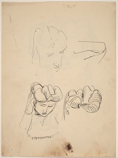 Curator: Before us is "Hals van een man en vrouw," or "Neck of a Man and Woman," created by Hans Borrebach. Though undated, it's thought to originate from before 1961, executed in ink on paper. A striking minimalist composition, wouldn't you agree? Editor: Striking is the word. The bold ink strokes—almost like calligraphy—define the forms with incredible economy. Notice how the negative space amplifies the subjects. It is minimal but effective. Curator: Indeed. Borrebach was active in a time of great social change in the Netherlands, moving from post-war reconstruction toward greater international engagement. Abstraction and simplified figuration were becoming increasingly prominent ways to express this sense of modernity. Does this speak to this historical narrative, would you say? Editor: Absolutely. I am drawn to this sense of incompleteness, which only underscores how our minds are hardwired to fill in missing parts of these pictures. Borrebach plays brilliantly with this perceptive phenomenon by leaving off most details and implying them with just enough suggestive strokes, the absence of color pushes the composition to be more simplified to essential aspects only. Curator: Precisely. The rapid strokes and lack of precise detail perhaps imply that these studies may have functioned more as notes than works ready for display in a formal gallery setting. It would be quite illuminating to know precisely when this work was produced to add some certainty to our knowledge. Editor: Well, there's an authenticity to it, wouldn’t you say? Raw yet confident and modern despite the date. The composition achieves great fluidity while the angular profiles of each head have a touch of understated drama. I find myself pondering whether Borrebach intended to evoke both their proximity to and separation from one another. Curator: A provocative idea. I am also considering these studies of form; considering Borrebach's position at the time could give more context of his oeuvre at that period. I like how Borrebach shows how much is possible by omitting aspects in representation and how form and space create an essential picture of figures in our thoughts. Editor: It indeed prompts reflection and engages with its material aspects and visual grammar of pure form to convey depth and perception. I am struck by the power of this line.