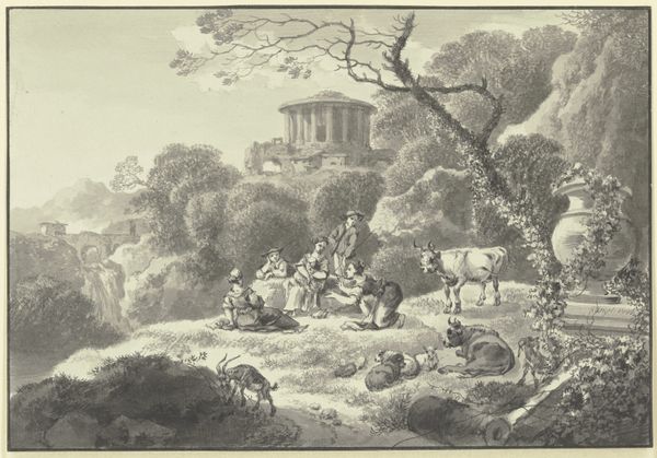Editor: This is "Enraged Vicar, from Miseries of Human Life," a print and etching by Thomas Rowlandson, from around 1807. The vicar's, shall we say, expressive state really dominates the piece! He looks absolutely furious. What historical or social dynamics do you think Rowlandson is commenting on here? Curator: It's interesting to note how Rowlandson situates the vicar within a seemingly idyllic landscape, isn't it? Consider the social hierarchy of the time. Hunting was a pursuit of the gentry, often at the expense of common lands and the clergy, who relied on those lands. Do you think Rowlandson's critique is directed solely at the vicar’s rage or something broader? Editor: Perhaps the encroachment of aristocratic privilege on the church's domain, then? The way the hunters seem oblivious to the vicar’s anger definitely paints them as inconsiderate. Curator: Exactly! The humor derives from that societal friction. Think about the role of caricature in Georgian England—it served as a potent form of social commentary, often poking fun at authority and class distinctions. It was also very performative! Editor: So it’s not just a snapshot, but an active participation in the social discourse of the day. It seems to go beyond just documenting and reporting! Curator: Precisely. Rowlandson uses caricature to actively shape public perception and stir conversation about social norms. It is meant for popular consumption and political reform, in its own way. Editor: I hadn't considered the active role of art in fueling societal discourse like this. Now I see the Enraged Vicar as a powerful visual statement instead of only a funny one. Curator: Right. Looking at art through the lens of social history opens up fascinating avenues to interpretation.