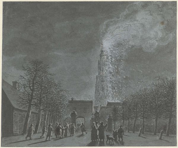 Kobayashi Kiyochika created this woodblock print, "The Conflagration Seen From The Hisamatsu District," which captures a scene of devastation with its intense colouration and dynamic composition. The sky is ablaze with hues of orange and grey, casting an eerie glow over the dark silhouettes of buildings and the gathered crowd. This contrast immediately draws the eye, creating a sense of drama and unease. The scene, dominated by the visual weight of the fire, invites reflection on the broader historical context of rapid modernization and urbanization in Japan. The formal elements here—the stark lines of the buildings, the fluid rendering of the flames, and the compressed perspective—reflect Kiyochika's engagement with both traditional ukiyo-e techniques and Western artistic principles. Ultimately, the print challenges fixed notions of beauty and disaster. The conflagration is not merely a destructive force but a spectacle, a moment of intense visual experience. The use of light and shadow, characteristic of Kiyochika’s style, serves not just to depict a scene, but to evoke a complex interplay of emotions, reflecting the transient nature of urban life and the ever-present potential for both creation and destruction.