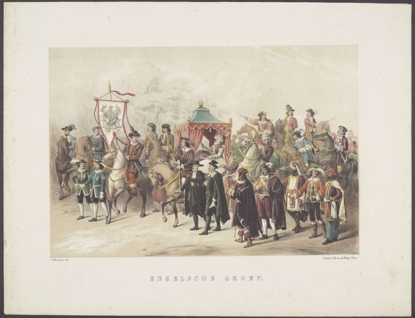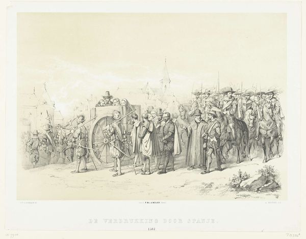 Augustinus Jacobus Bernardus Wouters created this print of the ‘Removal of citizens in captivity by Spanish soldiers, 1567’ sometime between 1829 and 1904. The subdued palette and the receding perspective create a somber mood, drawing us into a scene heavy with historical weight. Note how Wouters uses a frieze-like composition, positioning the figures in a line that emphasizes the procession and the act of displacement. This arrangement flattens the space, turning the scene into a tableau of power and subjugation. The texture of the print, achieved through careful layering, adds depth to the soldiers' uniforms and the rough texture of the cart carrying the prisoners. The slightly elevated viewpoint allows Wouters to capture a wide range of emotions, from the stoicism of the captives to the sternness of the Spanish soldiers. By focusing on the formal arrangement and the emotional tenor, Wouters prompts us to consider how power is visualized and experienced. The print underscores the structural and emotional dimensions of historical narratives.
