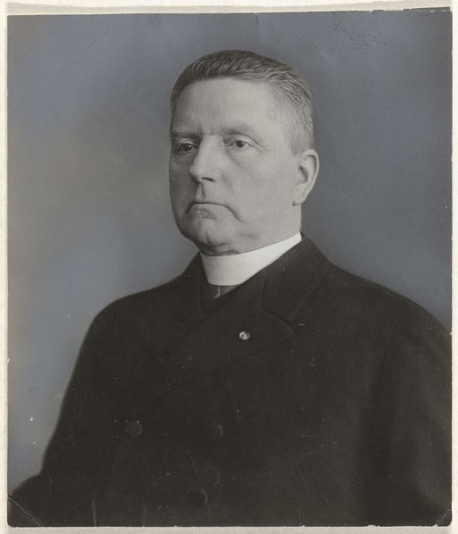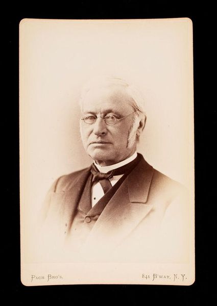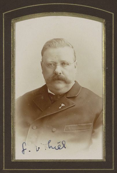 Editor: So, here we have a gelatin-silver print of Theodore Roosevelt, taken around 1910 by the Baker Art Gallery. He looks rather stern, and his gaze is quite intense, almost confrontational. What strikes you most about this image? Curator: It’s interesting to consider how carefully crafted this image is for public consumption. Look at the pin on his lapel, the formal three-piece suit, the carefully groomed mustache, even the pince-nez spectacles perched on his nose. This isn't just a portrait; it's a construction of power, designed to project a specific image of Roosevelt to the American public. Editor: A construction of power? That's interesting. Do you mean it's not necessarily a candid depiction? Curator: Exactly. In that era, photography was increasingly accessible but also perceived as objective truth. Portrait studios like Baker played a crucial role in shaping public figures' personas. Think about it – who was Roosevelt trying to reach, and what message was he trying to convey with this formal, almost austere presentation? Editor: I suppose he wanted to be seen as serious and competent, someone the public could trust, perhaps? Less the adventurous "Rough Rider" and more the statesman. Curator: Precisely! And the proliferation of these kinds of portraits, particularly through mass media, solidified his public image. The control of that image, how it circulated and was received, was key to his continued political influence. Who controls the image, controls the narrative. Editor: So it's less about Roosevelt the man, and more about Roosevelt the…brand, in a way? That’s a perspective I hadn't fully considered. I see now how much social context can impact our understanding of even a seemingly straightforward portrait. Curator: Absolutely. By understanding the cultural and political forces at play, we can unpack the layers of meaning embedded in a seemingly simple image and start to grasp its broader significance in American history. It is important to realize that the reception and use of the artwork can give new and perhaps alternative perspectives on the figure of Roosevelt. Editor: Thanks. This has given me a lot to consider regarding photography, power, and the construction of public image!