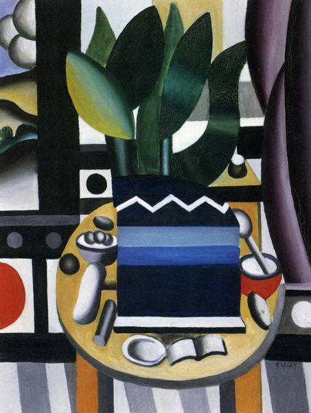 Curator: Gazing at Jean Metzinger's "La Roulette" from 1924, one immediately feels this odd stillness, a silent choreography of shapes. Editor: It's so playful, yet contained! The juxtaposition of that vivid color palette with these rigid, almost architectural forms…there's a delightful tension there. Curator: Indeed! Metzinger, ever the thoughtful Cubist, meticulously dissects and reassembles our perceptions of reality. Look at the way the composition integrates elements like a roulette wheel, a goldfish bowl, a banjo… Editor: …and the peculiar teapot! They’re like players in a visual game, all rendered in sharp, angular forms. It feels less about depicting the objects themselves, and more about capturing a fleeting sense of the Jazz Age, the buzz of excitement. Curator: Precisely. Metzinger aims to reveal the underlying structure of these objects and the sensations they evoke. Notice how he flattens space and fractures forms? This pushes us to see each element from multiple viewpoints simultaneously. Editor: You know, the more I look at it, the more I see it as a meditation on chance and artifice. That little goldfish swimming in its geometric prison, the spinning roulette... everything feels deliberate and controlled, yet suggestive of randomness. It's like Metzinger's showing us how life can feel at once both fated and utterly unpredictable. Curator: Yes, a compelling tension between order and chance—echoing the zeitgeist of the roaring twenties. What else catches your eye? Editor: It's got me thinking about what all of the elements truly symbolize for the artist: the guitar speaks of nights filled with rhythm and dancing, and of people casting aside their former restrained expectations. Curator: A truly vibrant reflection of a complex period viewed through a distinctive Cubist lens. Thank you for unpacking the composition. Editor: An intricate composition that encourages you to ponder the game of life and our pre-determined pathways; a wheel that decides one’s outcome while casting off constraints. Thank you.