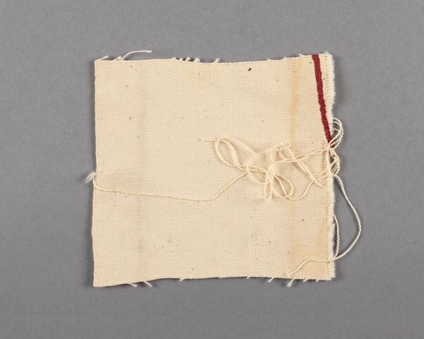 Curator: This small “Painted Canvas Fragment” by Barnett Newman strikes me as both incomplete and deeply powerful. The raw edges, the intense red… it feels like a moment caught mid-thought. Editor: Yes, "fragment" is key here, isn't it? The materiality is so present. Look at the weave of the canvas, the frayed edges, the very visible signs of cutting and tearing. It highlights the physical labor involved in art-making, even in abstraction. Curator: Absolutely, but for me, it transcends the labor. The red against the bare canvas, that raw confrontation—it's almost spiritual. A shard of something immense, reduced to its essence. Editor: Or, perhaps, a discarded experiment? A material study for a larger work where the artist was testing color saturation or the canvas's response to paint? The social and economic realities of producing art often involve such trial and error, waste, and re-evaluation. Curator: Maybe. But I prefer to think of it as a potent little reminder that even the smallest scrap can contain a universe. Editor: Indeed. It certainly gives us pause to consider the unseen processes behind the finished product, both artistic and industrial.