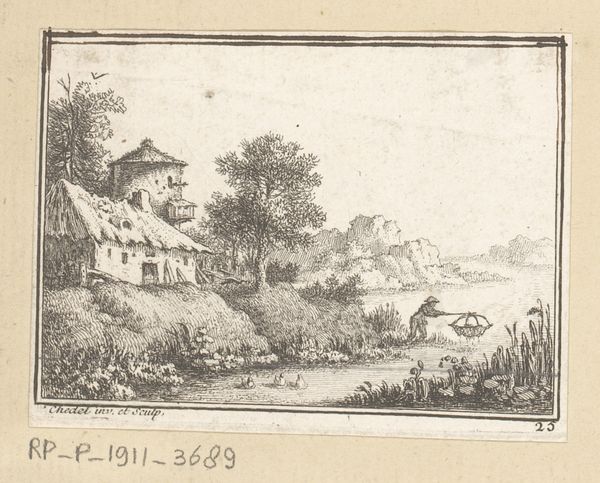 Editor: So, here we have "Landscape with two fishing figures and an inn on a river", an engraving by Quentin Pierre Chedel, sometime between 1725 and 1763. It has such a light, almost dreamlike quality to it. What strikes you most about this print? Curator: I'm drawn to the material conditions that made this image possible. Look closely. The lines etched into the copperplate, the way the ink adheres to the paper... Consider the artisan labor, the hours spent meticulously creating this reproducible image. These prints weren’t precious objects; they were part of a network of information, accessible to a growing consumer culture. How does that mass production affect its perceived value? Editor: That’s a great point! I hadn't really considered the printmaking process itself. So, its value comes, not necessarily from the image it represents, but the accessibility that the print offers and enables. But, if the image it portrays is part of that consumer culture, what does this landscape tell us about the 18th century and its consumption patterns? Curator: Precisely! It romanticizes rural life. It presents a carefully curated scene of leisure: figures fishing, an inviting inn, and rolling hills. Consider that alongside the increasing urbanization of the period. These images likely played a role in shaping perceptions and desires for an idealized, perhaps unattainable, country escape. It presents labor as peaceful past time, rather than an economic burden. Who had access to that image, and to that idyllic life that they likely never experienced? Editor: So, the value lies not just in its artistry, but in understanding its production, its role in disseminating ideas, and shaping the social landscape. It definitely shifts how I view it – beyond just a pretty landscape. Curator: Exactly. It’s about recognizing art as a product, influenced by – and in turn, influencing – the material world. Editor: Thanks. That's been really enlightening!